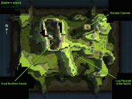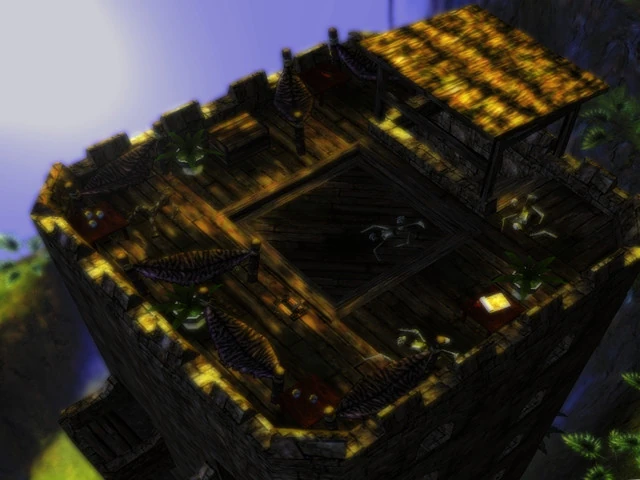 - One of the few structures on the island is a great tower; the lift platform at the top of this tower descends into the Volcanic Caverns.